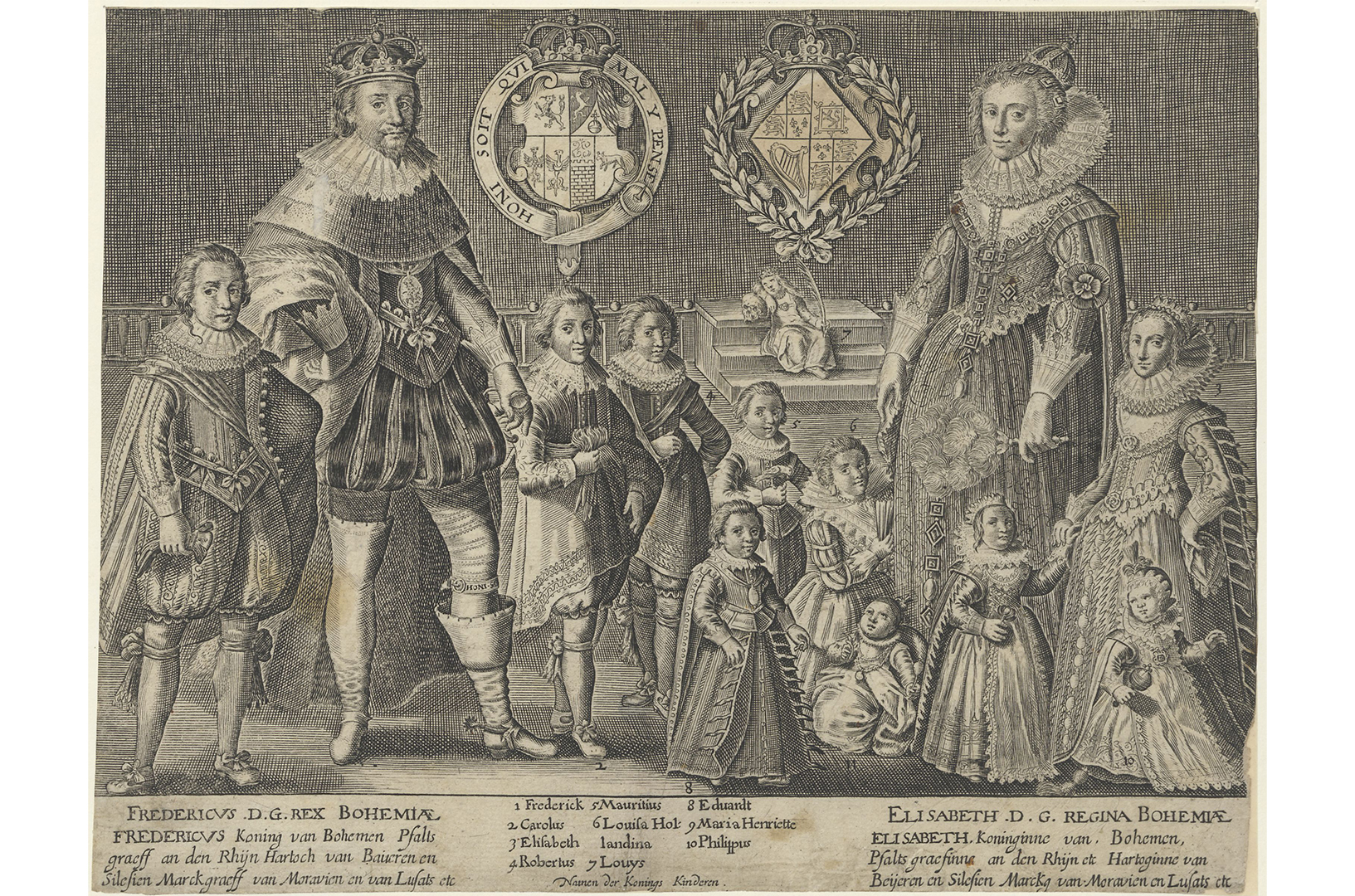 Family ties with the House of Orange, and its large English and Scots communities, made the Dutch Republic the natural place for the couple to seek refuge. In April 1621, Elizabeth and Frederick arrived in The Hague with a household of 223, including a shoe shiner and a wine bottle opener. The States General housed them in the house of the late Johan van Oldenbarneveldt on the Kneuterdijk, close to the Stadholder’s quarters, where Elizabeth would remain for forty years. Considering themselves unlawfully deposed, Frederick and Elizabeth continued to use the titles King and Queen of Bohemia. It was their children’s court and college, the Prinsenhof, that would be located in Leiden in 1624. Though the last child left the Prinsenhof in 1641, Elizabeth kept rooms for her own use until 1654. She did, however, donate a beautifully gilded goblet to the city as a token of her gratitude. The goblet can now be admired in the Museum De Lakenhal.