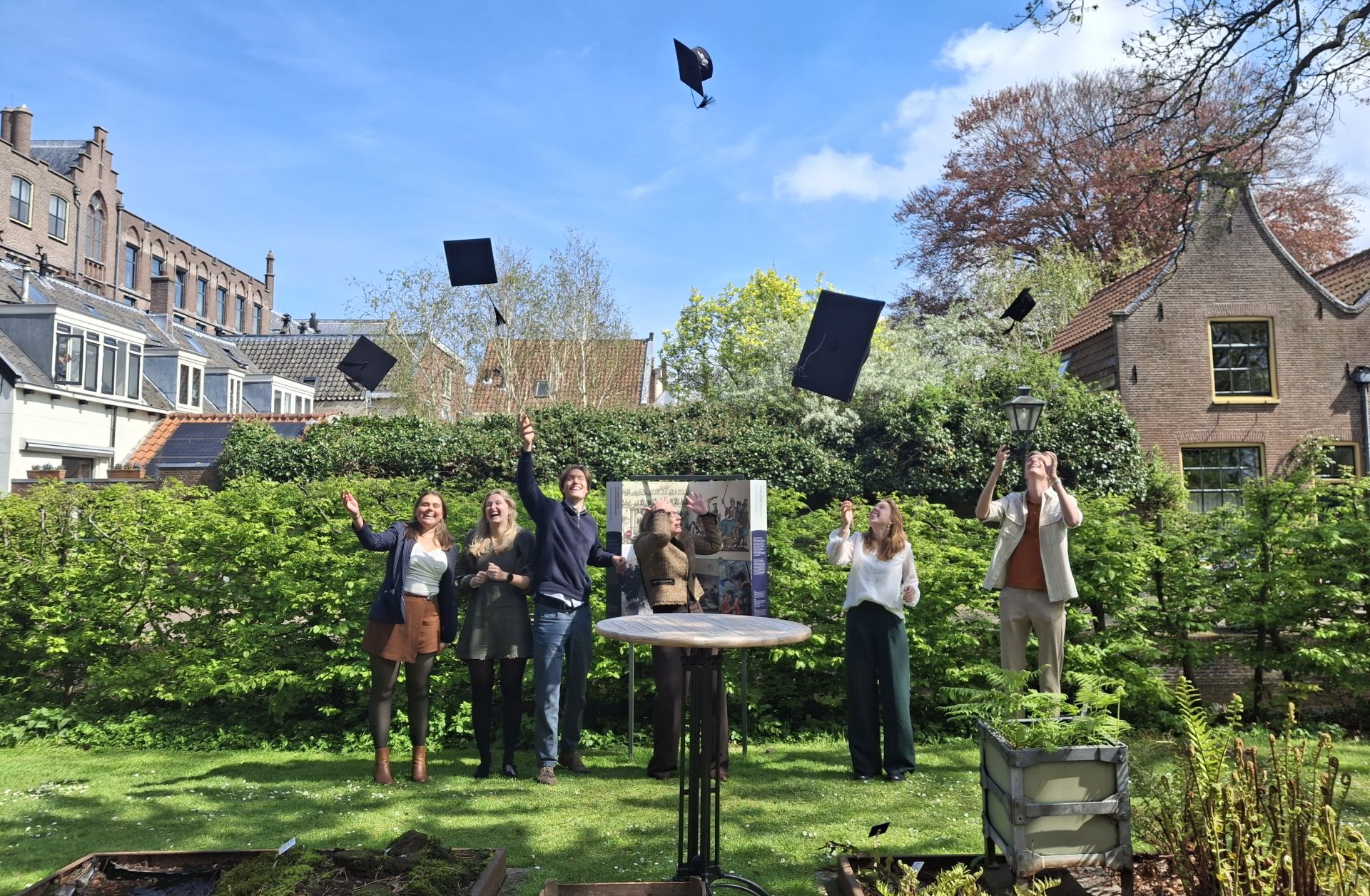 Five students threw graduation caps into the air together with Rector Hester Bijl and the exhibition was officially open. This outdoor exhibition in the lush green of the Hortus takes visitors on a 450-year journey through studying at Leiden University. The displays in the shape of giant books have visitors leafing through that long history: from lessons in the anatomical theatre to classes with VR headsets. The exhibition shows how students learn in lectures, study in libraries or observe in the field and the lab. And also how students over the centuries have suffered from pre-exam jitters and have finished their studies with much-loved rituals.