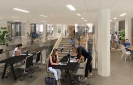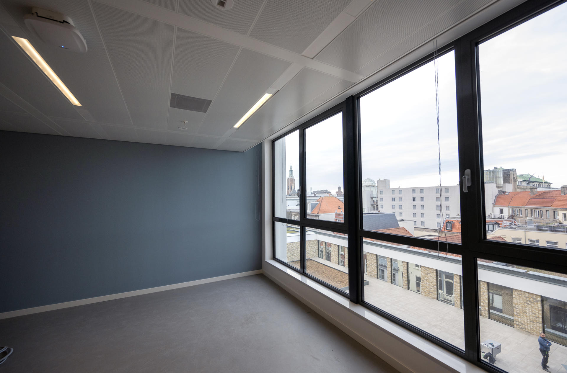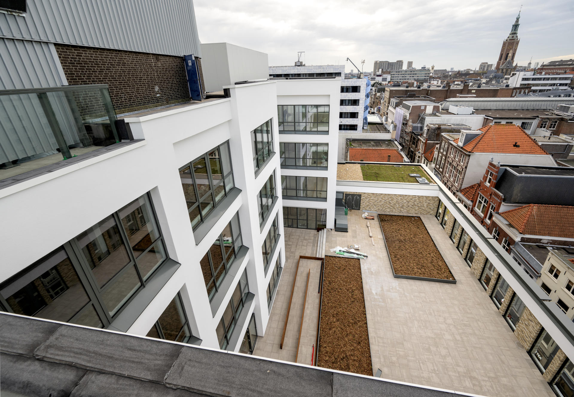 The third floor will house Leiden University’s teaching rooms, connecting seamlessly to the work and study spaces of the Open University. One floor higher, Leiden and Delft University of Technology will connect their worlds of technology, policy and impact on society. On the fifth floor, there are study and work spaces from Leiden University, and the LUMC focuses its research on health and preventive healthcare here. The Universities of the Netherlands will also have a presence here. Right at the top will be a vibrant student centre with an open common room and a rooftop terrace with a breathtaking view of the Hague skyline and Binnenhof.